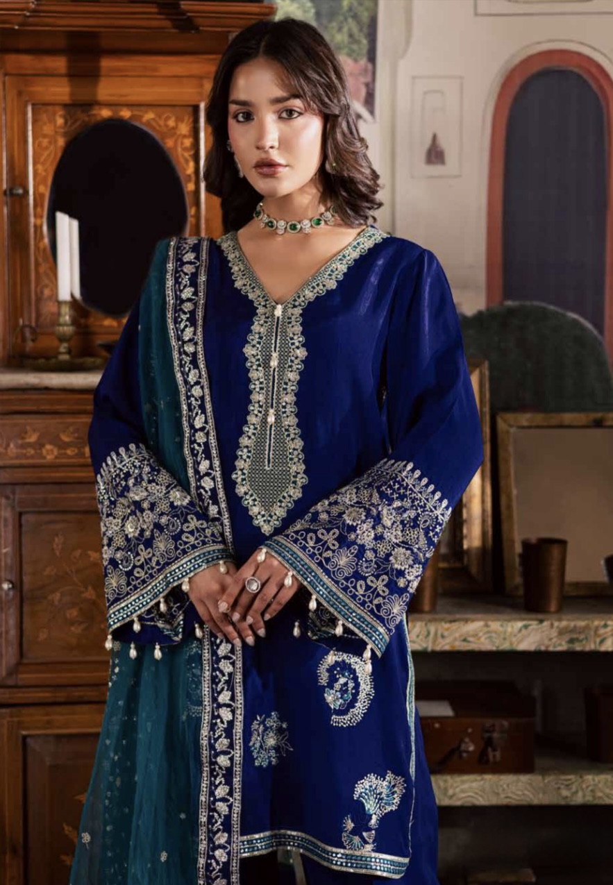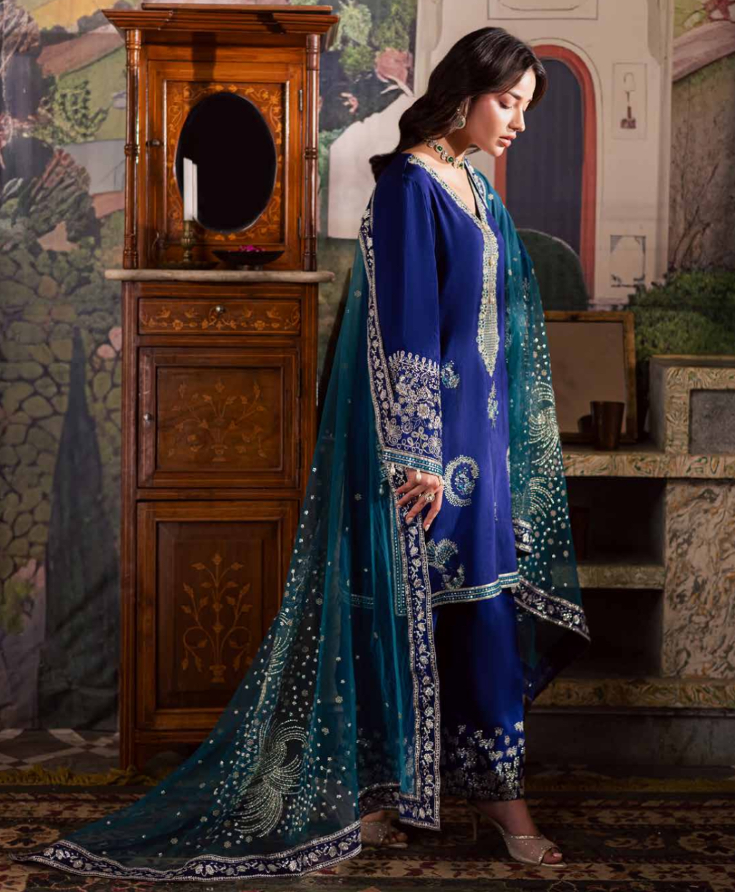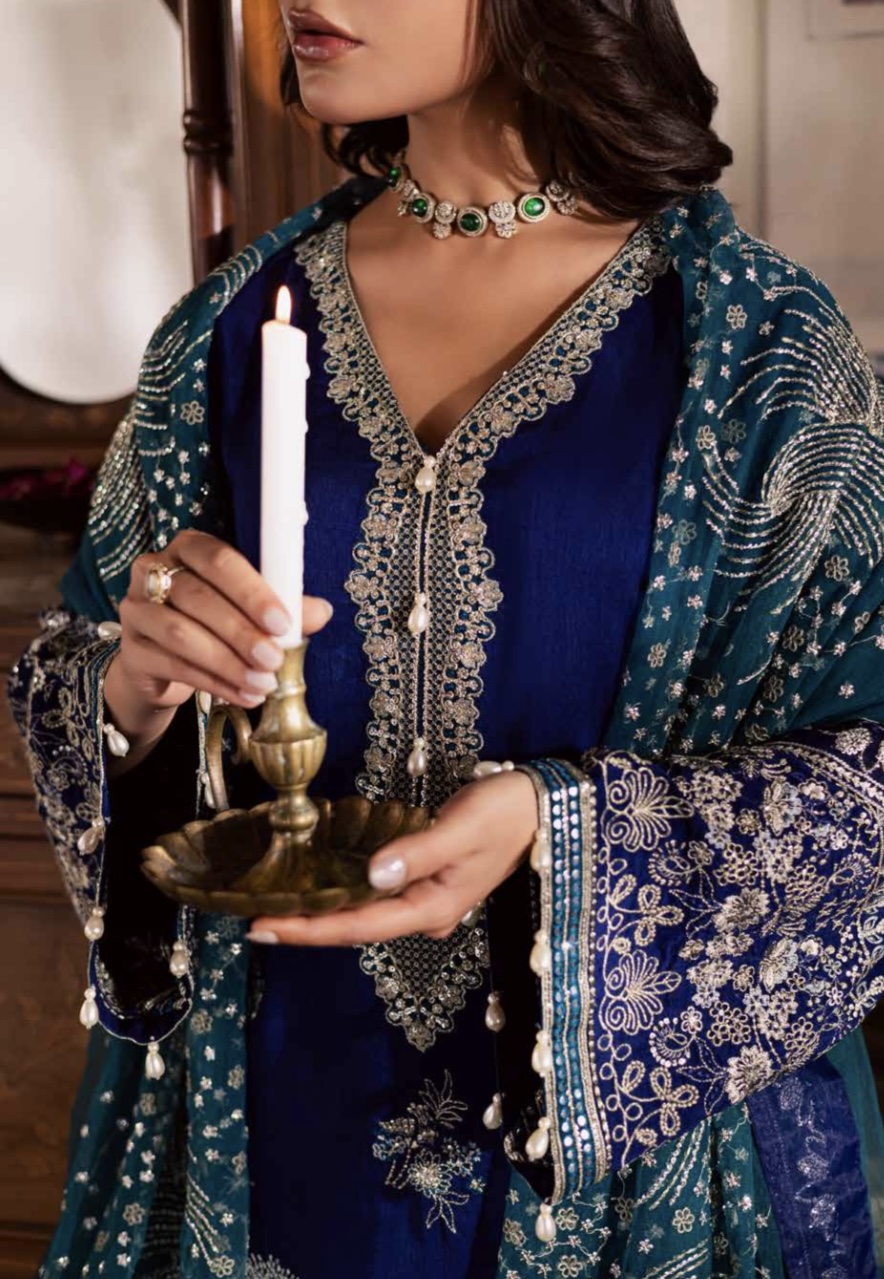 Premium silk with an elegant finish, beautifully embroidered for festive, formal, and evening wear.
