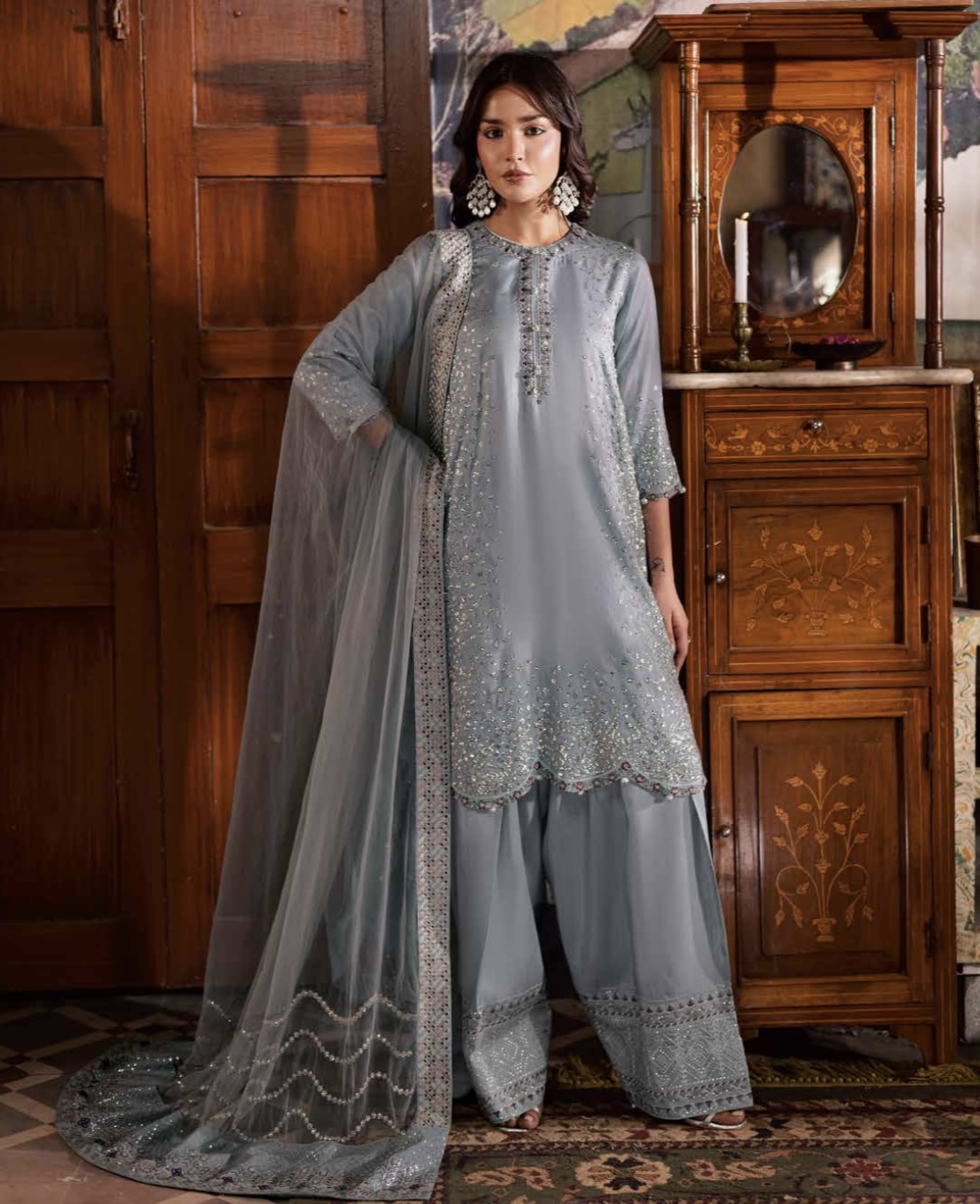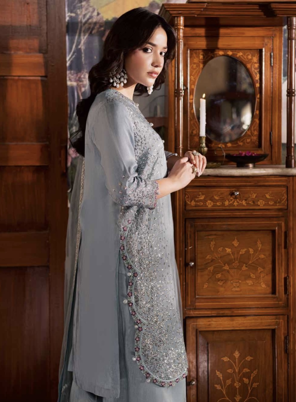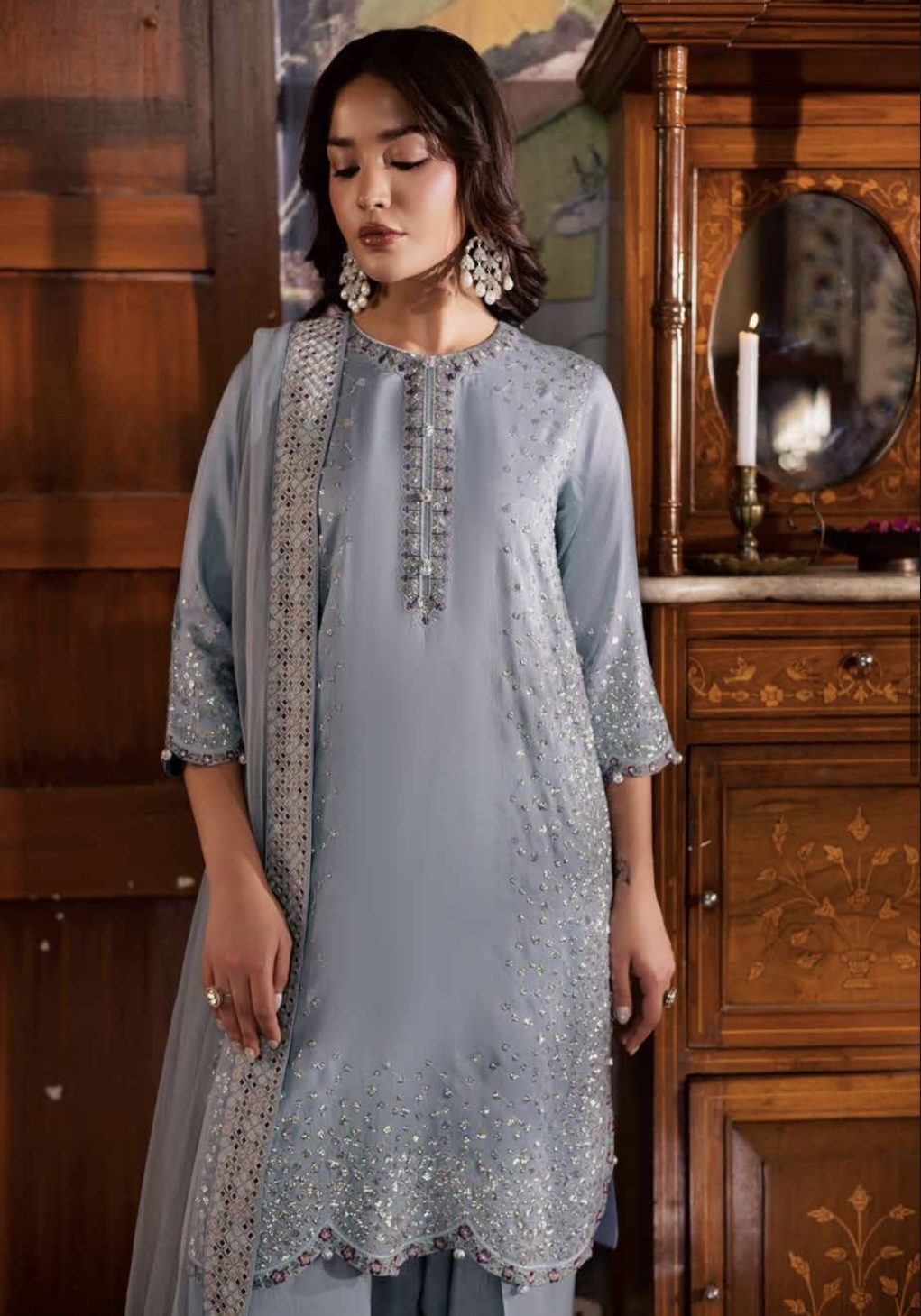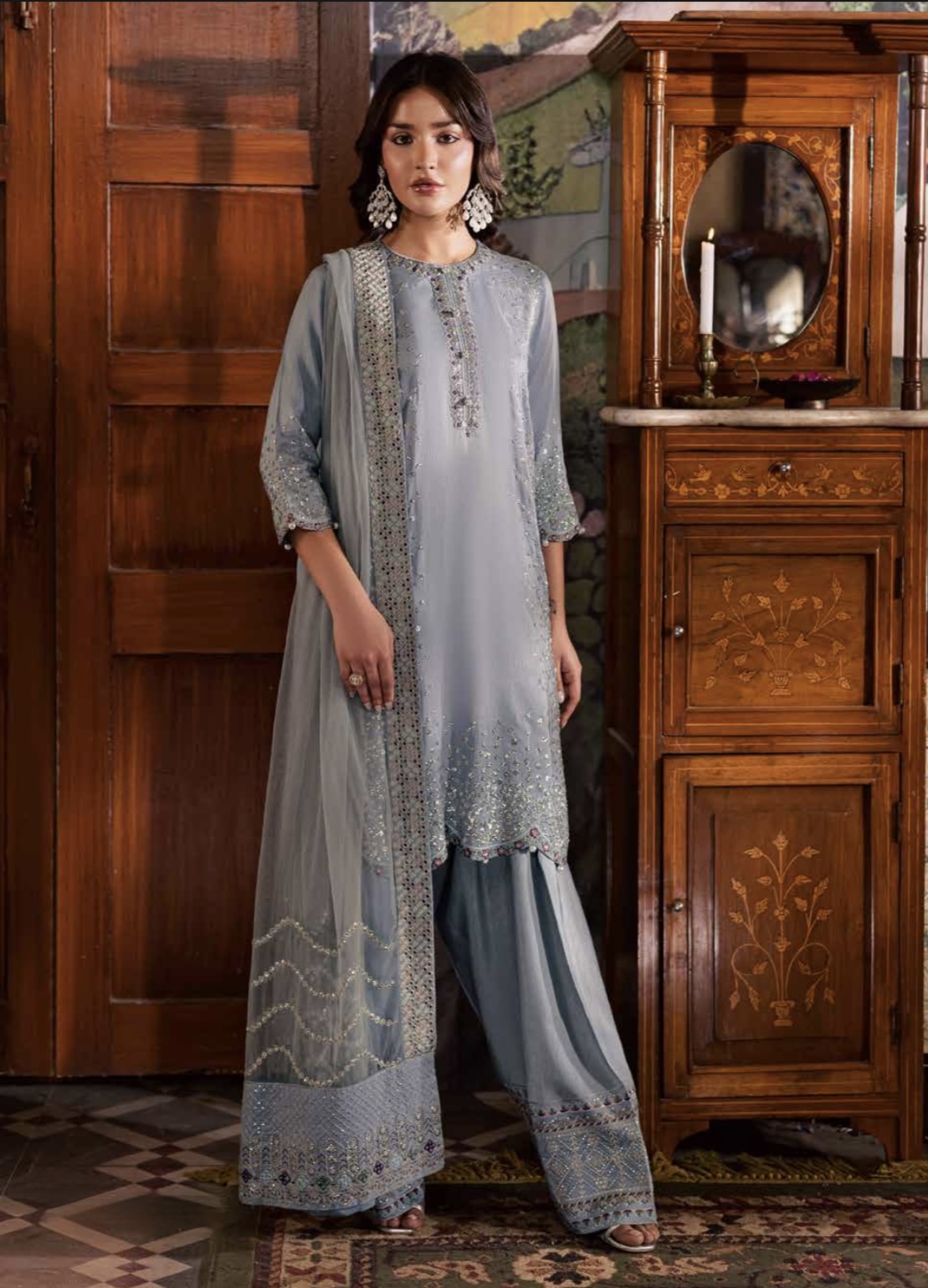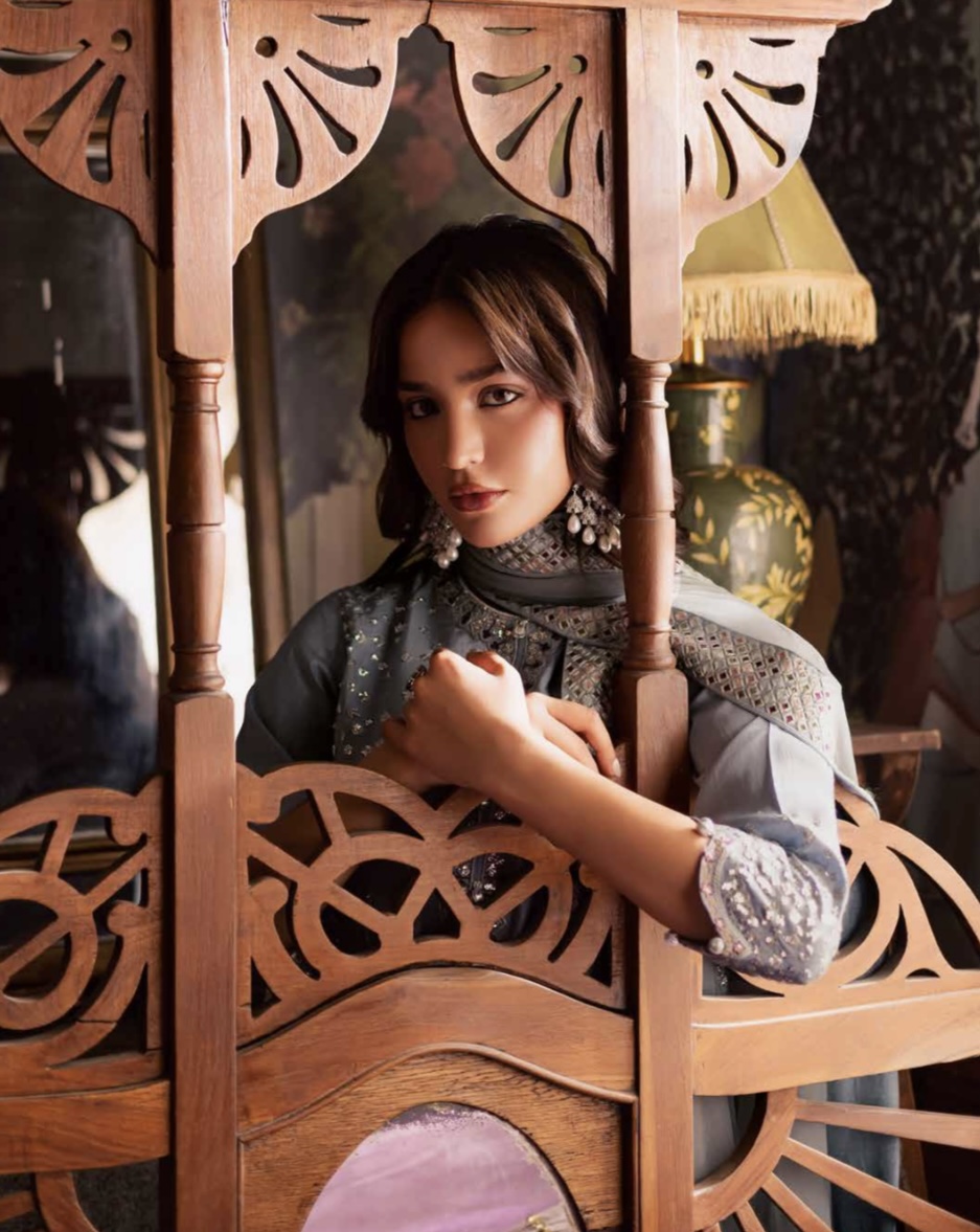 •Kameez: Unstitched embroidered silk with intricate detailing